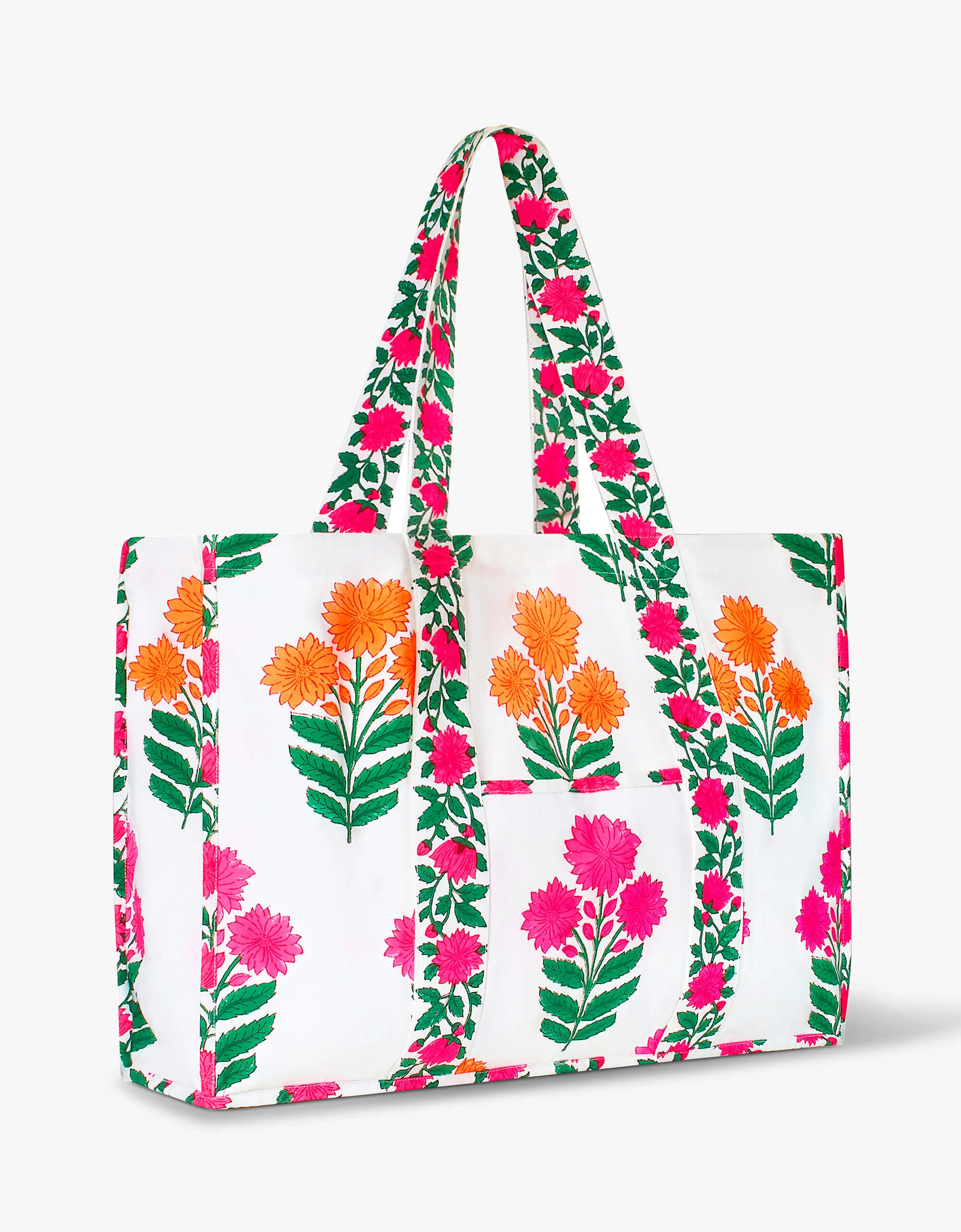 A playful twist on the everyday tote, our Neon Buta Canvas Tote is block-printed by hand in neon shades of pink and orange in bold floral motifs. Crafted from sturdy organic cotton, it’s spacious, lightweight, and easy to carry from beach to city. We love the clever border print handles to finish. Style it with our matching Neon Buta Ava dress for an effortlessly coordinated poolside look.